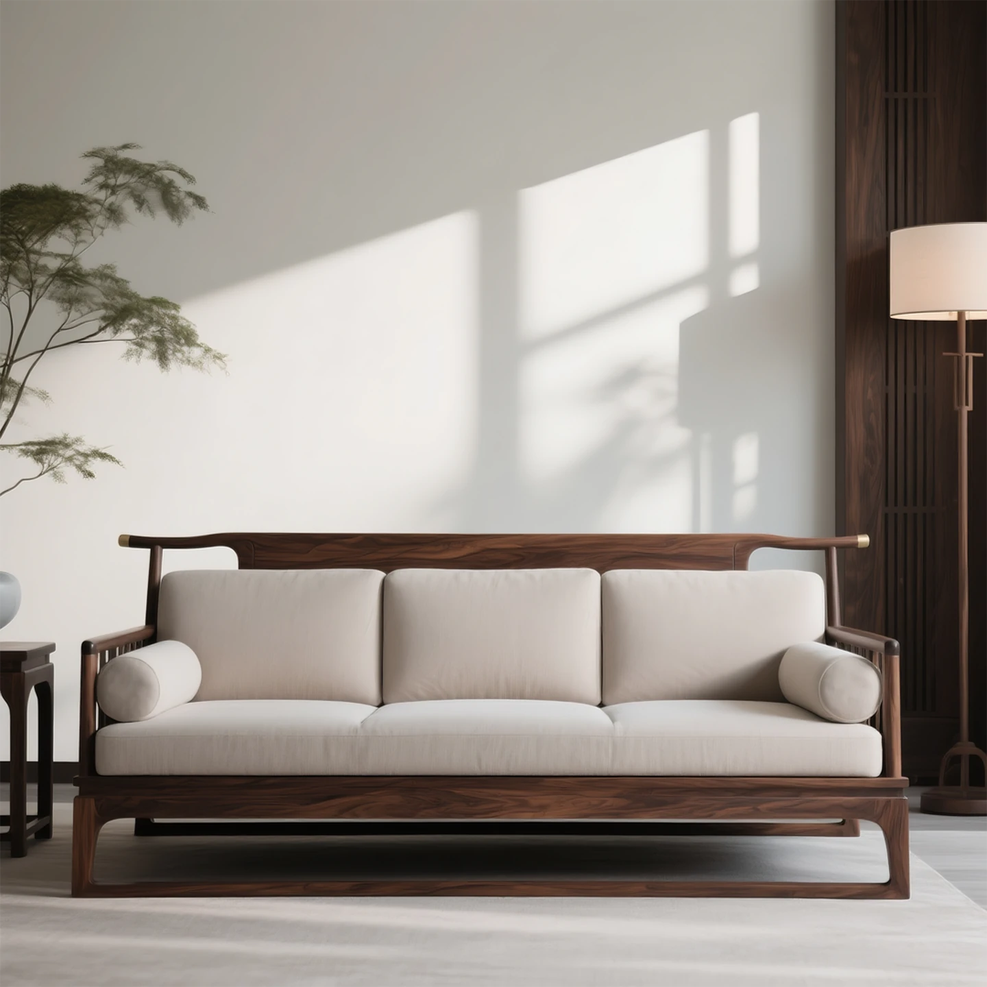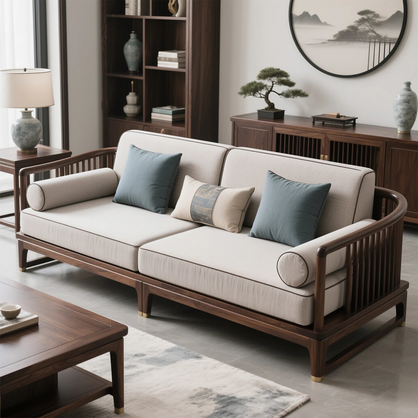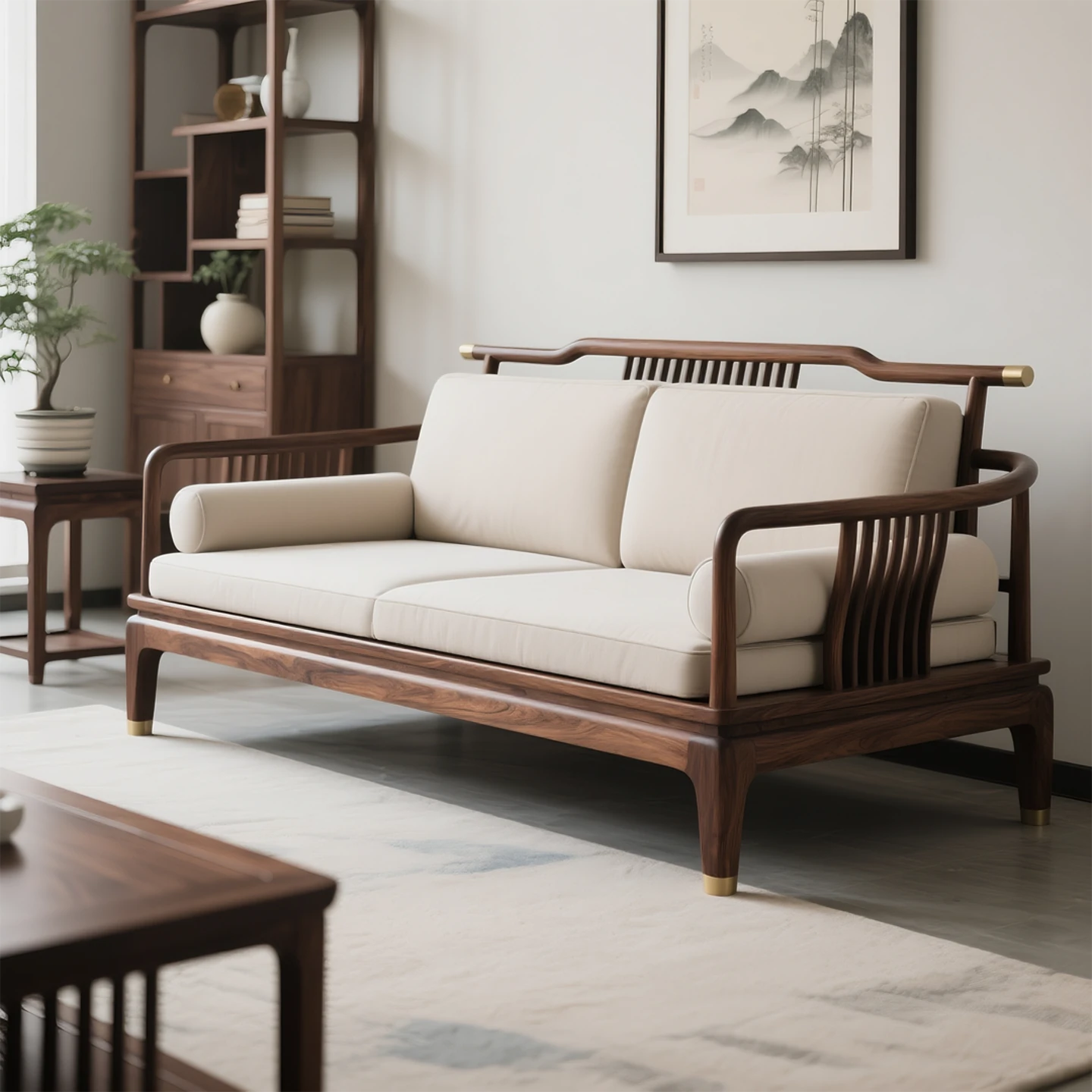 New Chinese Style North American Black Walnut Sofa - Aesthetic Song Dynasty Design for Serene Zen Living Rooms, Perfect for Spacious Open Concept Offices and Minimalist Wabi-Sabi Furniture.