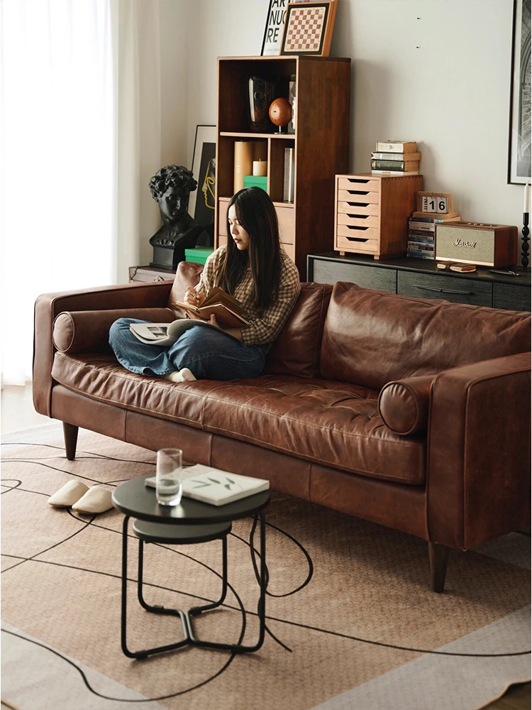 Vintage Genuine Leather Sofa - French Style Double Seat for Small Spaces, Mid-Century American Retro Waxed Leather Three-Seat Couch for Cozy Living Rooms