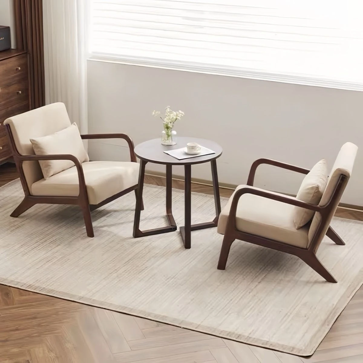 Compact Balcony Tea Table and Chair Set – 3-Piece Wooden Lounge Furniture for Small Spaces, Perfect for Reading and Enjoying Tea at Home.