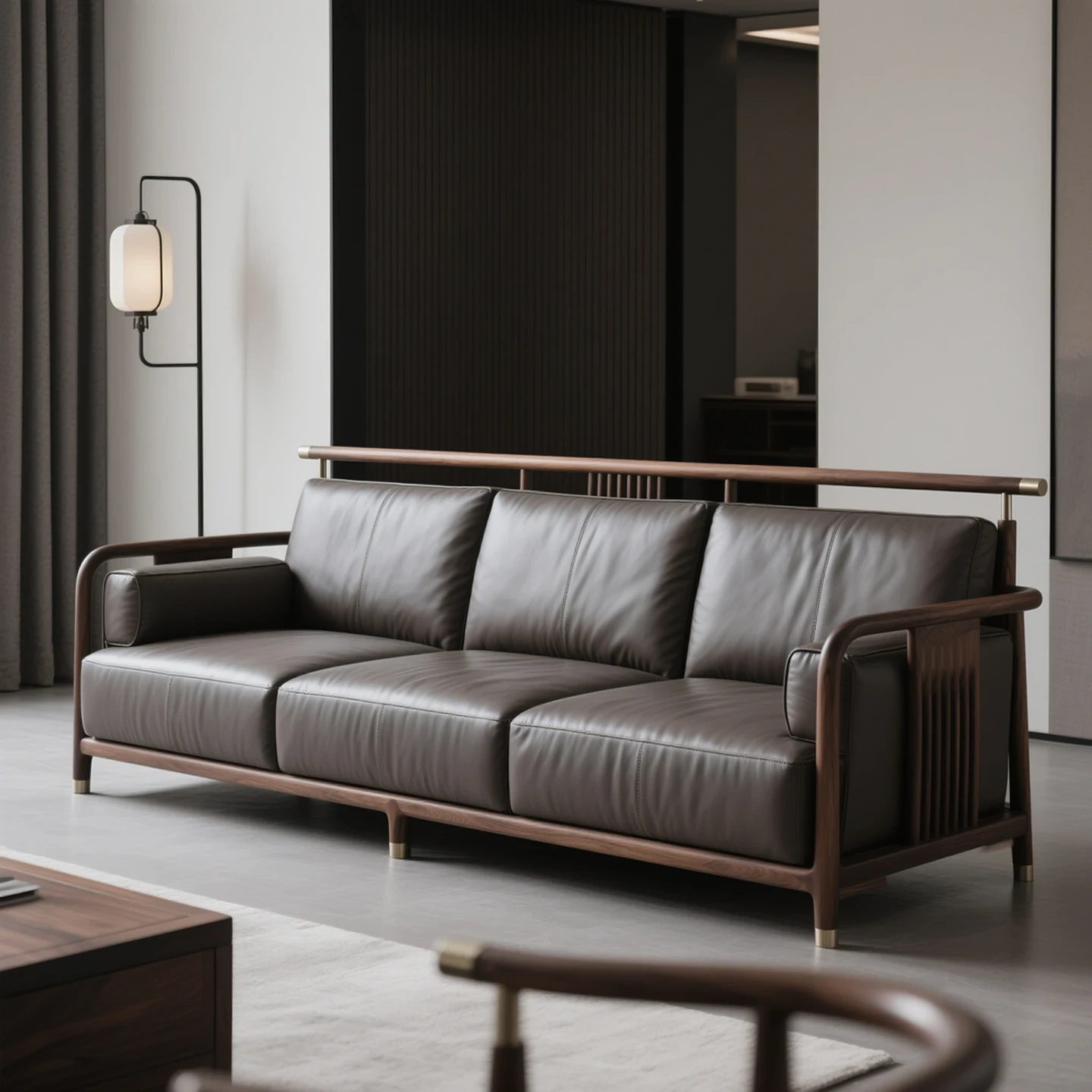 North American Black Walnut Leather Sofa - Modern Minimalist Design with Vintage Charm for Luxurious Zen Aesthetics in Your Villa Living Room