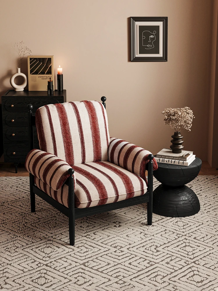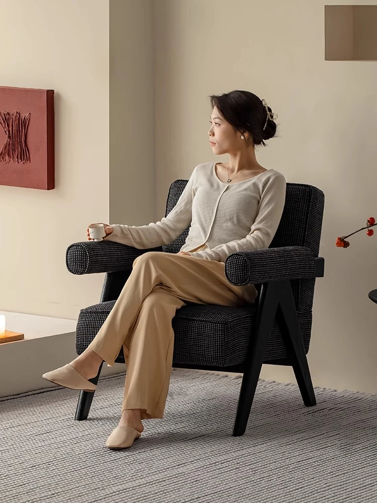 侘寂スタイルの無垢材単独ソファチェア - モダンでシンプルなデザイン、レトロ感あふれる背もたれ。チャンディーガルのリビングにぴったりなリラックスチェア!