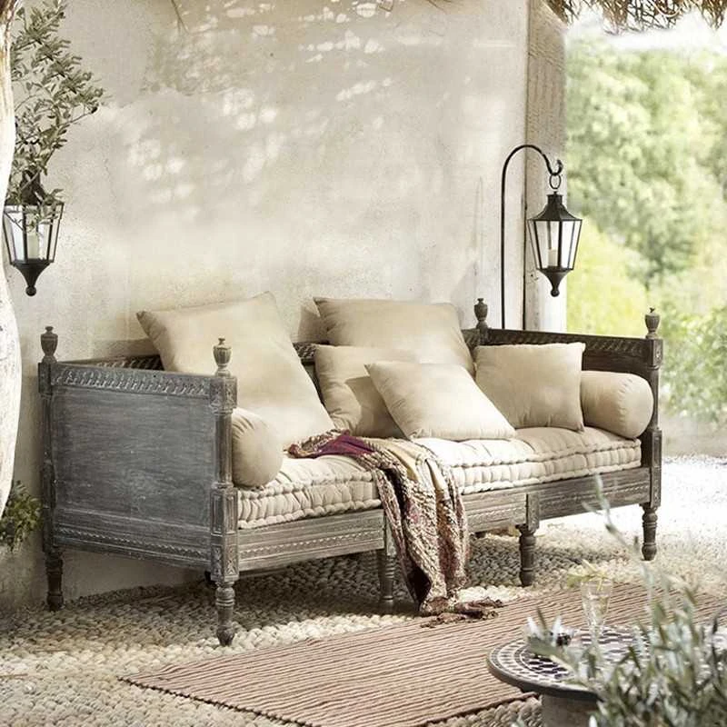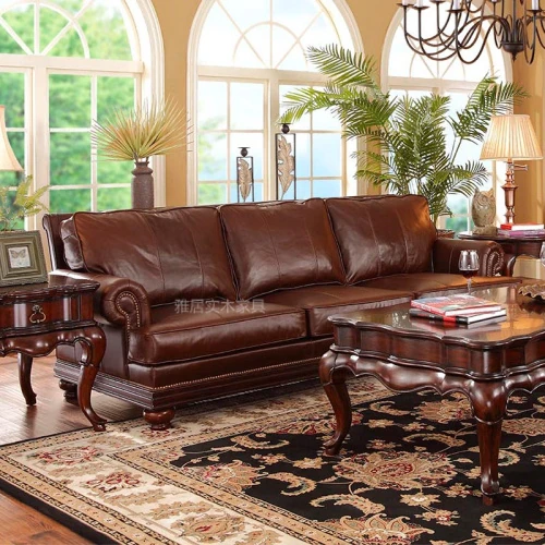 アメリカンカントリースタイルのヴィンテージ全木製ソファ - 高級真皮三人掛け、広々としたリビングに最適な別荘用ソファ。贅沢なくつろぎを提供します!