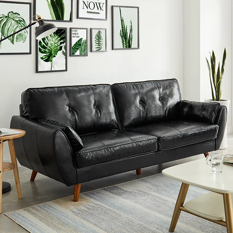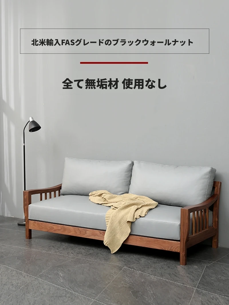北欧スタイルのブラックウォルナット無垢材リビングソファ - 本革トップグレイン牛革使用!2022年新作、ダブル3人掛け、テクノロジー布で快適さも兼ね備えた贅沢な一品。