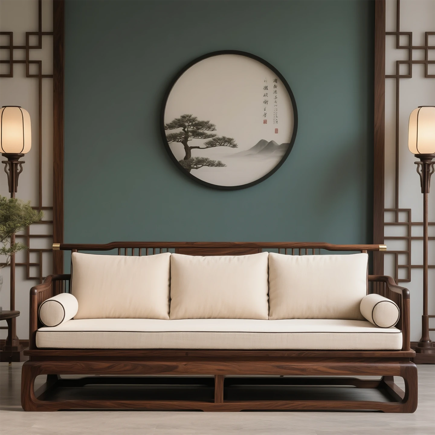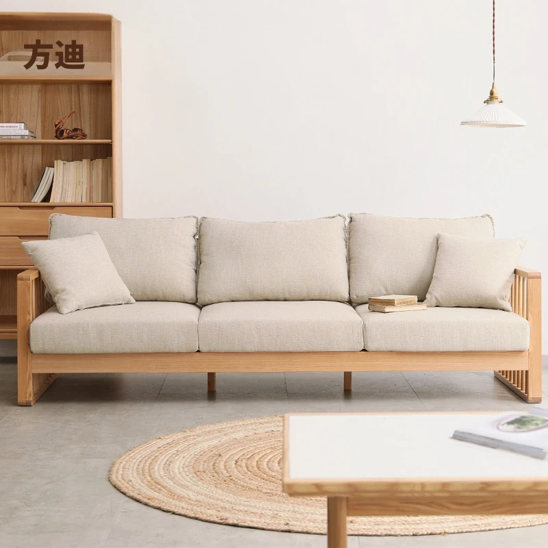 新中式デザインの無垢材ソファ!洗練された禅の美学を取り入れたシンプルなフレームとファブリックで、ヴィラのリビングにぴったり。デザイナーが手がけたこだわりの逸品、即納でお届けします!