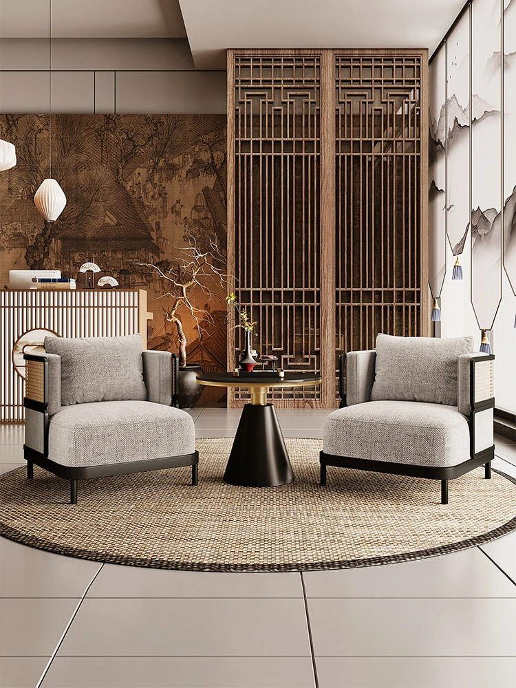 新中式デザインのラグジュアリーなリラックスソファチェア - ホテル客室や茶楼、会所にぴったりな一人掛け椅子。おしゃれな接待エリアに最適なテーブルと椅子のコンビネーションで、心地よいひとときを提供します。